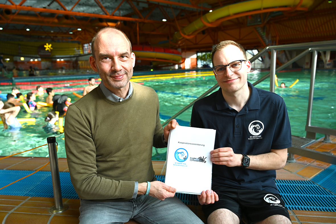 Damit diese, in der Talentschule begründeten besonderen Förderangebote auch im Rahmen der Startchancen an unserer Schule weiter Bestand haben können, wurde am Dienstag, den 17.02.2026, zwischen dem Ricarda-Huch-Gymnasium, vertreten durch den Schulleiter Herrn Westhoff, und dem Schwimmverein SC Aegir 1936, vertreten durch Herrn Schrader, ein Kooperationsvertrag unterschrieben.